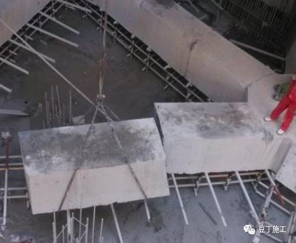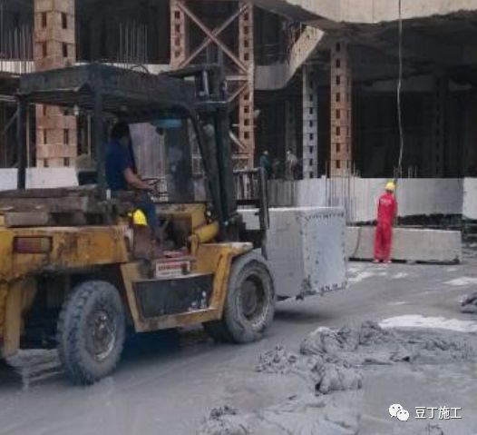 梁切割完成一定数量后可以开始吊运出场,为节约吊车费用,尽量减少吊车的移动。同时为保证吊车的施工安全,一般不在吊车吊重半径覆盖范围内的梁段均采用叉车进行转运,叉车转运要控制梁段的平衡,避免梁段砸到楼板。同时严禁叉车将梁段叠加放置在楼板上。一般地下室结构均有后浇带,需要采用 10mm以上厚钢板制成临时通道板,避免损伤楼板结构。电梯井、楼梯间等空洞处需要搭设叉车通道,严格按照计算的立杆或型钢间距进行安装,确保叉车平稳。吊车在调运时应有专职指挥,并保证司机不疲劳作业。同时,每部土方车运输不得超载。梁块叉车转运及吊装实景见下图。