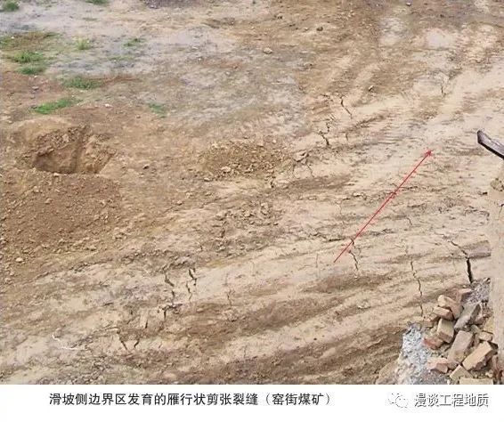 7 滑坡舌与滑坡鼓丘:滑坡体从滑坡剪出口滑出后伸入沟、堑、河道或台地上形似舌状的部分称为滑坡舌。国内也有称为滑坡头部(类似泥石流的龙头)的,由于滑动面反翘或滑坡体浅部受阻,该部分常形成垂直滑动方向的一条或数条土垄,称为滑坡鼓丘。8 滑坡台阶和滑坡平台:滑坡体在滑动中因上下各段的滑动次序和速度的差异,在其上部常形成一些错台,每一错台形成一个陡壁,此称为滑坡台阶。宽大的台面叫做滑坡平台,有时该平台具向山缓倾反向坡,叫做反坡平台,是滑坡的一个典型地貌特征,尤其是沿弧形面旋转滑动的滑动。9 滑坡后缘:主滑壁与山坡原地面的交线称为滑动后缘。10 滑坡前缘:滑坡舌前部与原地面线的交线叫做滑坡前缘,其最突出的地点叫舌尖。11 滑坡洼地和滑坡湖:滑坡滑动后,滑坡体与主滑壁之间拉开形成沟槽或陷落成“地堑”状,相邻土楔向山反倾形成四周高、中间低的洼地,称为滑坡洼地。当滑坡壁向外渗水或地表水汇集于洼地中形成渍泉地或水塘时,就成为滑坡湖。12 拉张裂缝与主裂缝:位于滑体上部因滑坡体下滑而张开的长达数十米至数百米、方向与滑坡壁吻合或大致平行的裂缝称为拉张裂缝,其中与主滑壁重合的一条称为主裂缝。13 剪切裂缝:位于滑坡中下部的两侧,因滑坡体与两侧不动体间发生剪切位移而形成的裂缝叫做剪切裂缝,它形成滑坡的两侧边界。14 羽状裂缝:滑坡体两侧剪切裂缝尚未贯通前,因动体与不动体间相对位移剪切形成的呈羽状(雁行状)排列的张裂缝称为羽状裂缝。15 鼓胀裂缝:滑坡体下部因下滑受阻挤压隆起形成垣垅(鼓丘),在其上形成垂直滑动方向的鼓胀裂缝。16 放射状(扇形)张裂缝:滑坡体下部因下滑受阻而形成的顺滑动方向的压张裂缝,在滑坡主轴部位大致平行滑动方向,两侧呈放射状(扇形)分布。在滑坡大滑动前,它先于鼓胀裂缝和滑坡剪出口出现,是抗滑段受压的标志。滑坡滑动后,滑体向两侧扩展也形成张裂缝,在舌部呈放射状分布,故称为放射状张裂缝或扇形张裂缝。