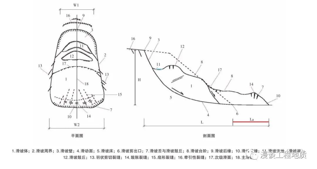 《边坡与滑坡工程治理》(第二版)一书中,把一切自然的与人为的岩土斜坡统称为斜坡。一般情况下,把一切由于工程建设而开挖与填筑的斜坡,称为边坡。滑坡通常指由自然原因引发的正在蠕动与滑动的自然斜坡,称为自然滑坡;另一部分滑坡则由于边坡开挖或填筑而引发老滑坡复活或自然滑坡的加剧而引发大规模滑坡,通常工程界把这种边坡列入在滑坡范围之内,称为工程滑坡。2 滑坡的十八大要素(注:这里单指完全发育的正在活动的滑坡,一般野外见到的滑坡不会是十八种要素样样具备)