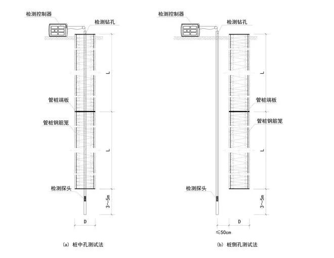 混凝土基桩桩身为钢筋混凝土、预制混凝土桩,一般带有桩头钢端板和桩尖。因钢材是铁磁性材料,与周围介质间存在明显的磁性差异。桩身钢筋、桩头钢端板、桩尖处的钢材在地磁场的磁化作用下,产生的磁感应强度叠加在正常场之上,使基桩周围的磁场强度发生变化,形成延桩长方向的磁异常特征。磁测井法就是根据磁场变化曲线以及磁异常梯度,来判断多节桩配桩形式和实际桩长。基于磁法的桩长检测,在工程实践中有两种典型的检测方式,分别为桩中孔测试法和桩侧孔测试法,具体方案如图所示(以钢筋混凝土管桩为例)。