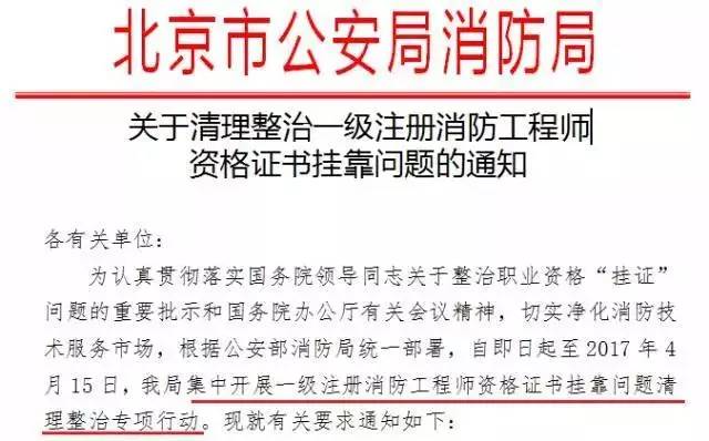 2、北京:《关于清理整治一级注册消防工程师资格证书挂靠问题的通知》