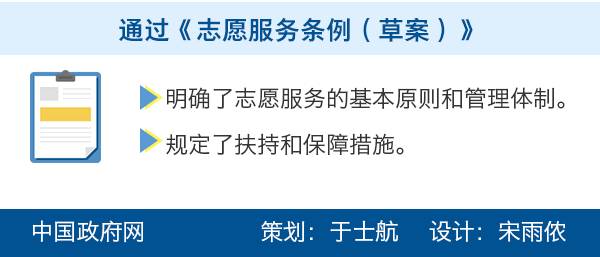 会议还部署新建一批大众创业万众创新示范基地,推动体制机制创新和经济转型升级;通过《志愿服务条例(草案)》以及研究了其他事项。