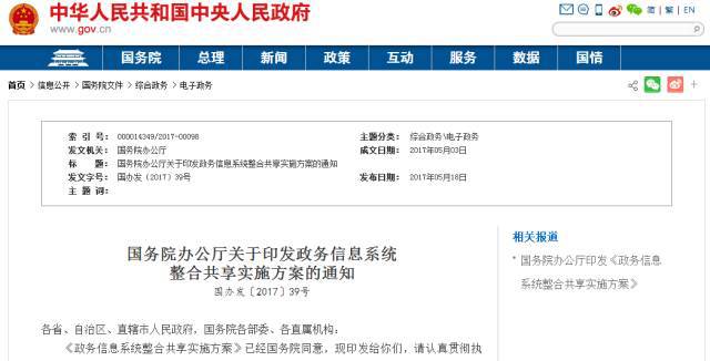 近日,国务院办公下发《关于印发政务信息系统整合共享实施方案的通知》(国办发〔2017〕39号)。2017年7月底前,全国政务信息共享网站将正式开通上线,实现政府部门间跨地区、跨层级的信用/招投标/社保等数据信息共享与业务协同应用。