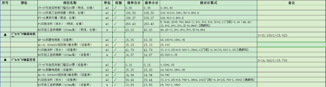 如图1:Excel计算底稿的计算式,房间部位做法清楚、明确