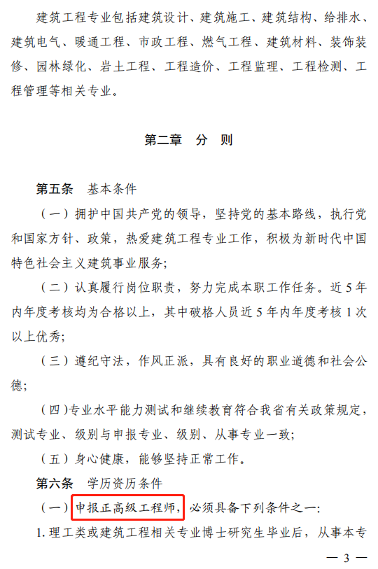 职称评审坚持德才兼备、以德为先的原则,科学客观公正评价专业技术人才。申报建设工程职称评审的人员(以下简称申报人)应当遵守宪法和法律法规,具备良好的职业道德和敬业精神,符合《标准条件》规定的申报条件。申报人一般应在本人劳动关系所在单位申报,且为在职的专业技术人员,不得以挂靠、兼职等形式在其他单位申报。