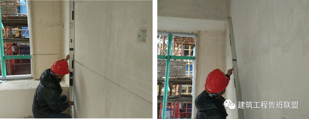 垂直度的施工质量主要依靠放线贴饼冲筋阶段的尺寸控制,后期抹灰使用2m铝合金方通、阴阳角刨刀等工具进行施工。