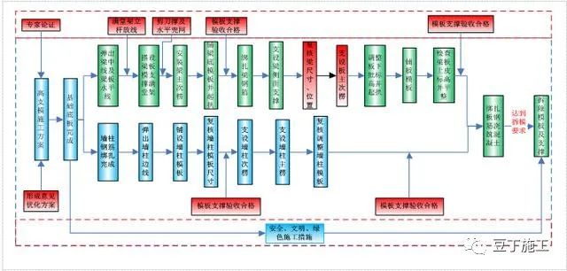 弹梁轴线并复核→搭支模架→调整托梁→摆主梁→安放梁底模并固定→梁底起拱 →扎梁筋→安侧模→侧模拉线支撑(梁高加对拉螺栓)→复核梁模尺寸、标高、位置→ 与相邻模板连固。