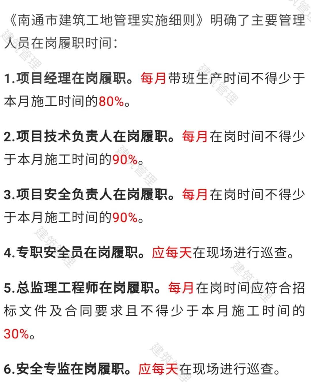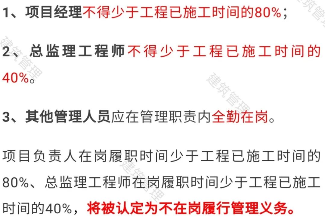 项目经理每月在岗时间不得低于施工时间的80%!