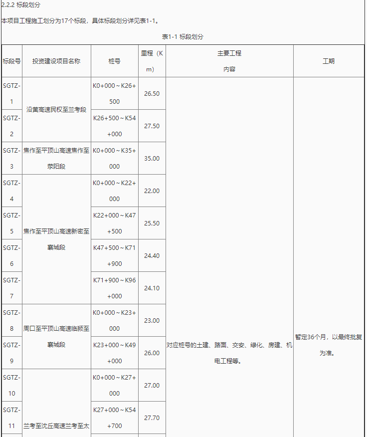 标段划分:本项目工程施工划分为9个标段,具体标段划分详见下表。