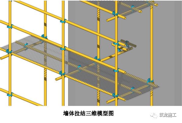 2. 混凝土浇筑前将预埋件埋入剪力墙或梁内(或设置穿墙螺栓孔),刚性连接件焊接螺母的一端套入预埋件(或穿墙螺栓),另一端通过扣件与脚手架立杆固定