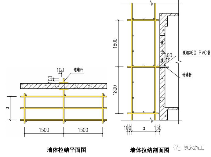 在剪力墙上预埋Ф 60 mm PVC管,a为800 mm或1050 mm (悬挑式脚手架为800 mm,落地式脚手架为1050 mm),通过预埋管拉通一根连墙杆与架体连接。