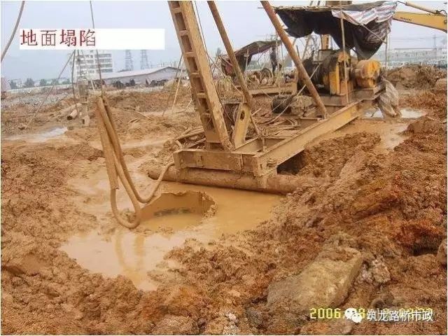( b)由于掏渣后未及时补允水或泥浆,或河水潮水上涨,或孔内出现承压水,或钻孔通过砂砾等强透水层,孔内水流失等而造成孔内水头高度不够;