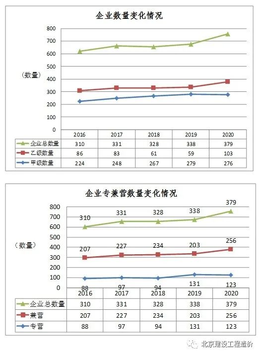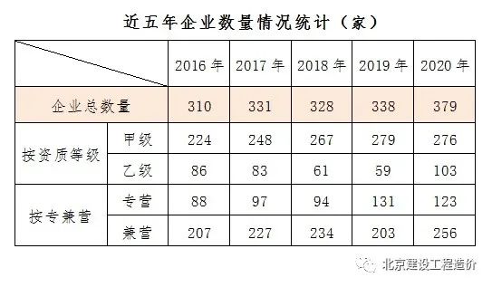 统计数据显示,近五年造价咨询企业数量逐年增长,2020年达到379家,该数据不包含2020年新申请资质且未报统计数据的一大批企业。甲级企业数量逐年增加趋于平稳,乙级企业2020年数量急增,随着企业数量的增加,竞争将变得更加激烈。