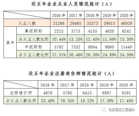 统计数据显示,近五年企业从业人员数量呈现逐年递增的趋势,尤其是2020年从业人员数量比2019年增加7316人,注册造价工程师人数逐年增长,而占从业人数比例呈逐年下降趋势,高级职称和中级职称人数同样呈现逐年递增趋势,占从业人数比例在一定范围内趋于平稳。从人员数量来看,造价咨询行业队伍在逐步壮大。