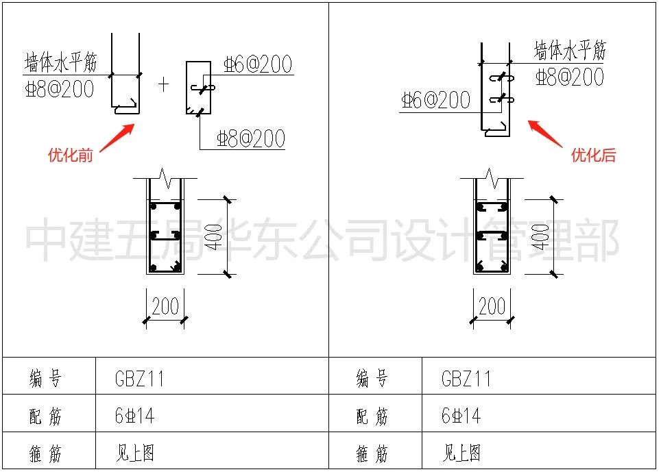 原设计剪力墙构造边缘构件采用外套箍,而规范允许将符合要求的墙体水平筋作为箍筋使用,优化后取消原设计外套箍。注意:此时构造边缘构件的体积配箍率仍应满足规范要求。