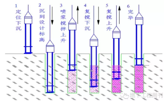 两侧钻杆高压喷浆,中间钻杆空压机喷气,同时旋转搅拌使得每幅水泥土体水泥含量更均匀。