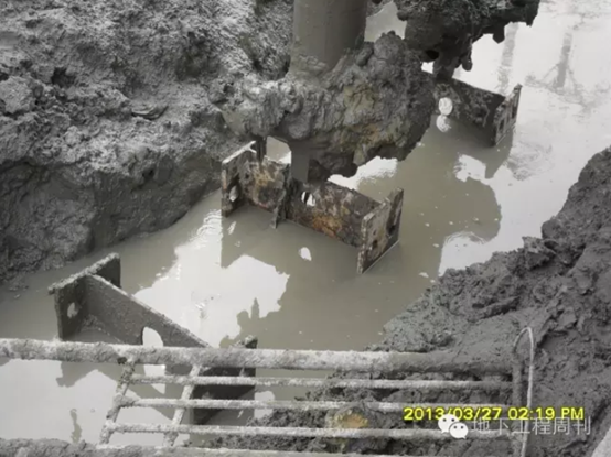 (5)停机、停电机械故障处理方法及措施:发生意外停机事件,将钻杆提高100cm,重新搅拌,防止出现断桩或夹层现象,若两桩咬合超过24小时,则第二根桩采用增加20%浆量,或采用加桩。当H型钢不能完全靠自重完全下插到位时,采用挖掘机进行送压或采用振动锤振动下沉使型钢插到设计标高。当上述方案失败时,割除露出地面部分的型钢,在外侧加一幅水泥土搅拌桩,加插型钢作强度补偿。在长时间停工后恢复施工时,应在外侧加作一幅单排水泥土搅拌桩,以防止内档因时间过长造成新老搅拌桩接触面的缝隙漏水。