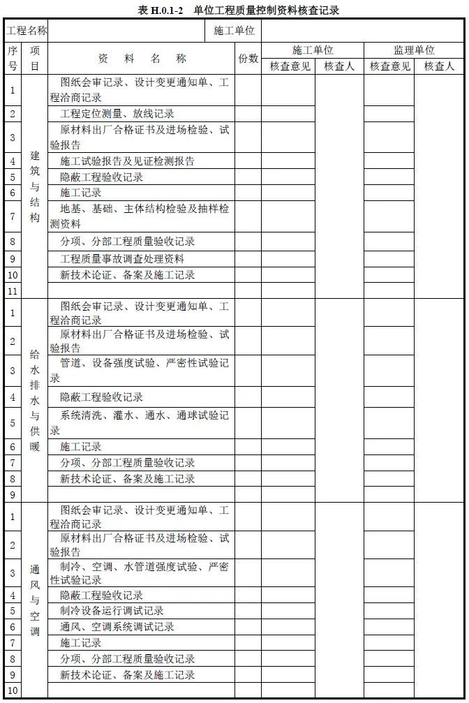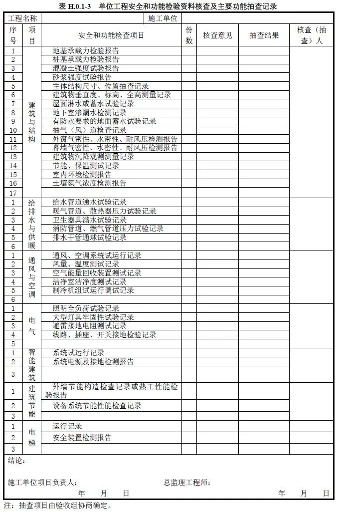 单位工程质量竣工验收记录、质量控制资料核查记录、安全和功能检验资料核查及主要功能抽查记录、观感质量检查记录应按《建筑工程施工质量验收统一标准》附录H填写。