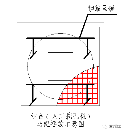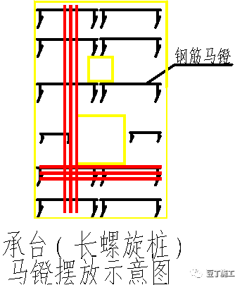 2)承台钢筋绑扎先铺底板下层钢筋。根据设计和规范要求,决定下层钢筋哪个方向钢筋在下面,参照16G101-1第66-70页安装,绑完下层钢筋后,按间距0.8m 左右设置钢筋马凳,马凳及附加钢筋应支设在下层钢筋网上,不得直接落在保护层,在马凳上摆放纵横两个方向定位钢筋,钢筋上下次序及绑扣方法同底板下层钢筋。马凳高度H=承台高—混凝土保护层厚—上层双向钢筋直径—下部钢筋单向钢筋直径,桩承台采用下图的钢筋马凳)间距800mm 左右设置,如下图: