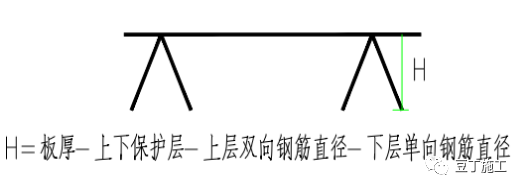 (4)绑扎一般用八字扣,除外围两根筋的相交点全部绑扎外,其余各点可隔点交错绑扎(或全部绑扎)。如板为双层钢筋,两层筋之间须加钢筋马凳以确保上部钢筋的位置。为确保上部钢筋的位置,在两层钢筋间加设马凳铁间距800mm。h=楼板设计厚度—上下保护层—上层双向钢筋直径—下层单向钢筋直径。