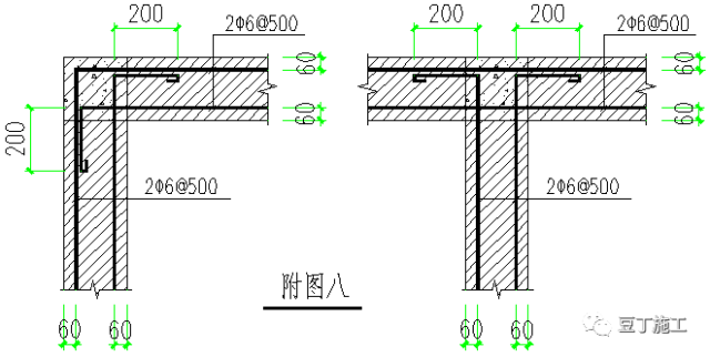 6、外墙转角处板上部附加钢筋、内墙阳角处板上部附加钢筋、悬挑板阳角附加钢筋配置分别详见附图六(1)、(2)、(3):