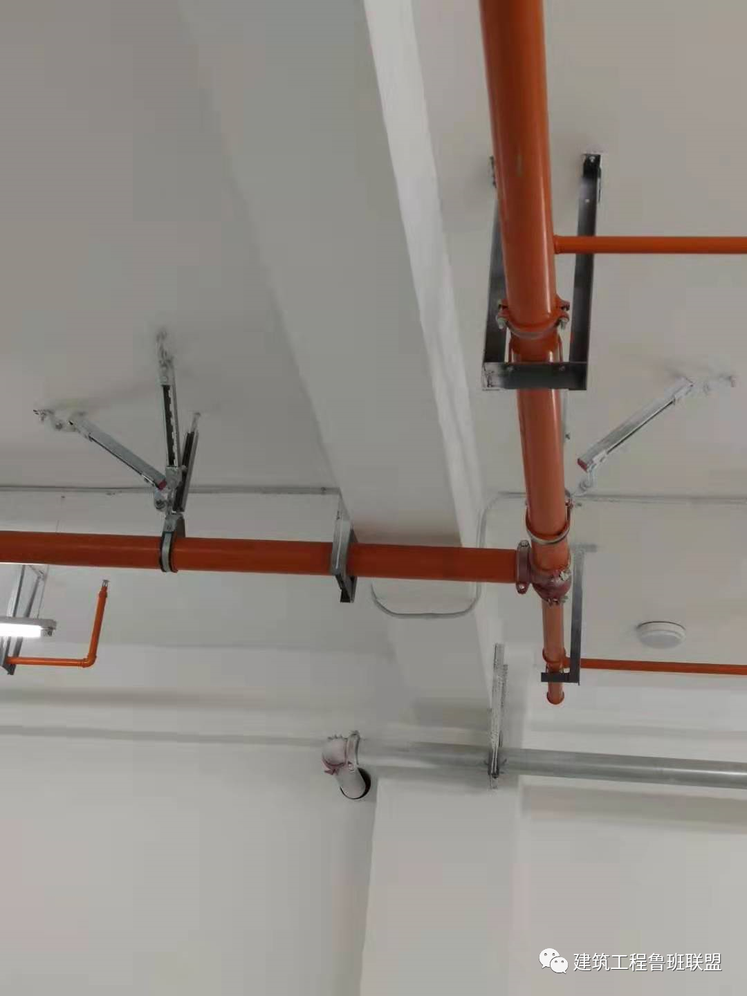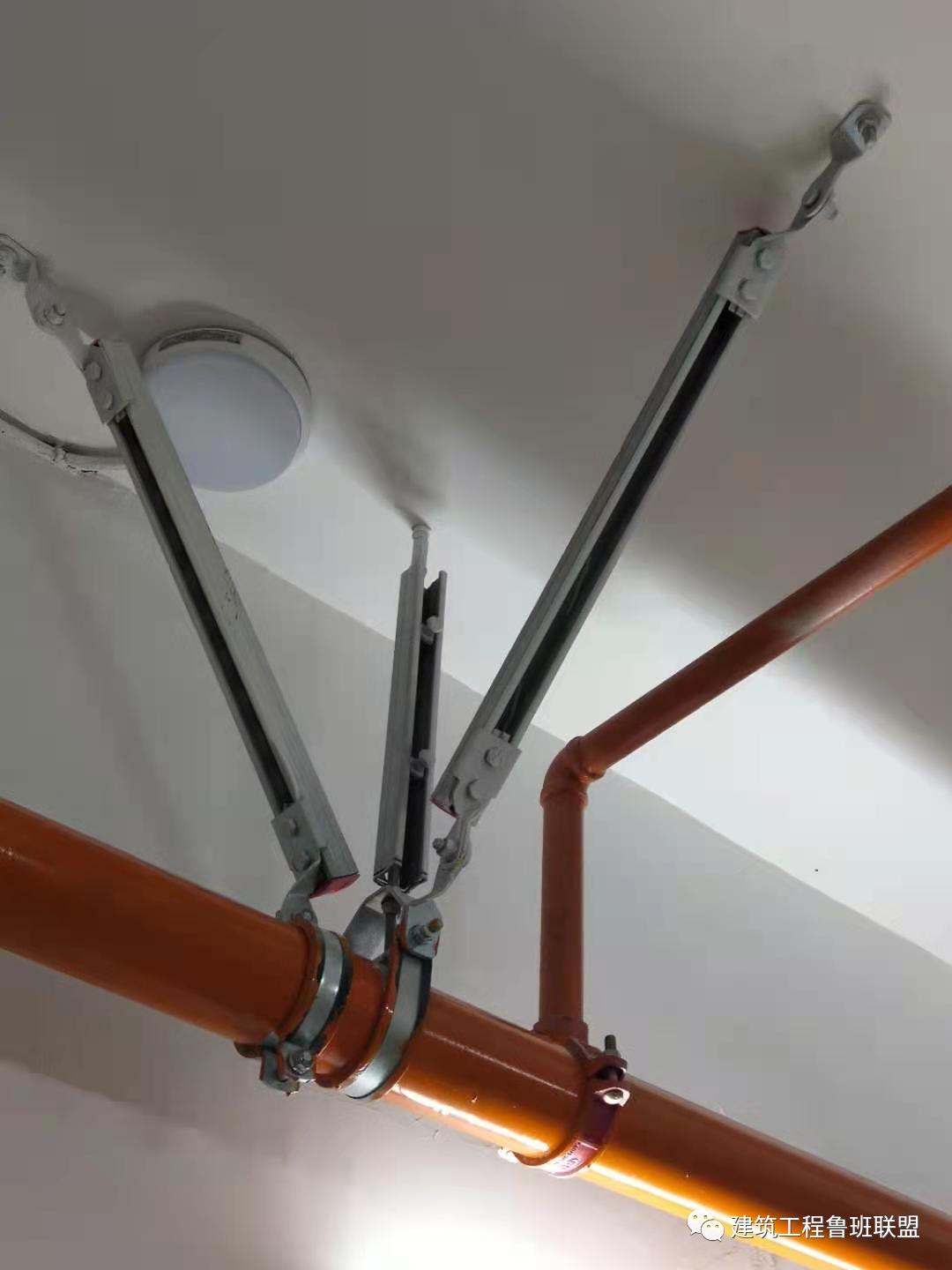单管抗震支架安装示意图:DN65以上的给水、热水、消防管道(含消火栓、气体灭火、喷淋等)系统。当管道中安装的附件质量大于25kg时,也应设置侧向及纵向抗震支架。