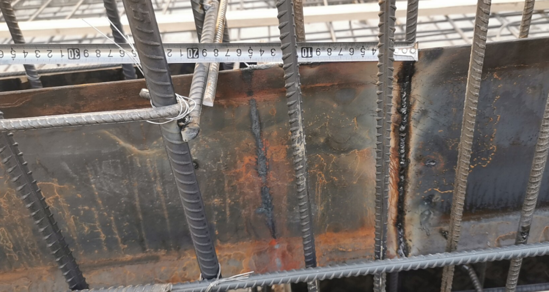 (2)钢板搭接方式:规范要求钢板搭接不小于20mm,双面满焊,为保证钢板焊接质量,本工程钢板双面搭接焊接长度为150mm。
