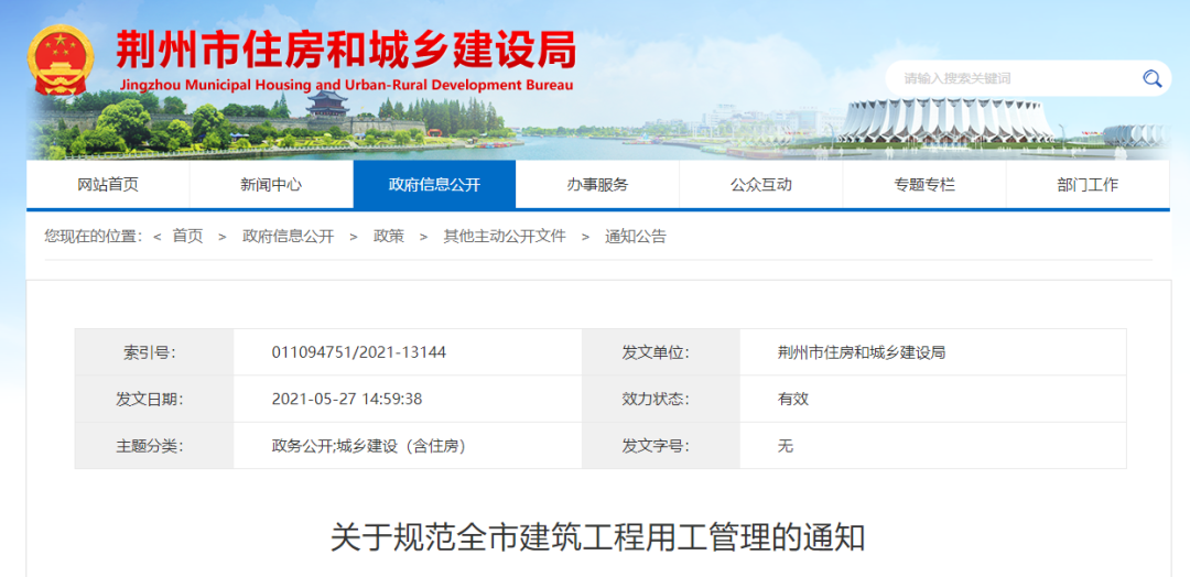 5月27日,荆州市住建局发布《关于规范全市建筑工程用工管理的通知》。相关内容如下: