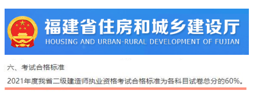 2021年度福建省二级建造师执业资格考试合格标准为各科目试卷总分的60%。