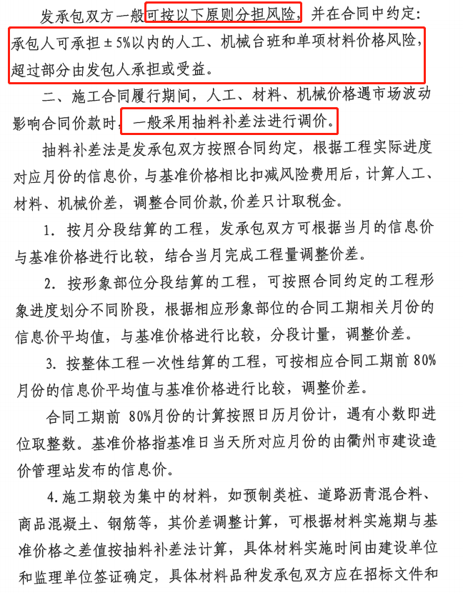 1.发承包双方应增强主要材料价格风险防范意识,充分考虑材料价格波动对工程造价、工程质量、施工安全的影响,施工合同必须明确约定主要建筑材料价格风险控制条款,不得采用无限风险、全部风险规定合同条款中的材料价格风险内容和范围。主要材料的种类由发承包双方在合同约定,主要材料价格约定的风险幅度应控制在5%以内。