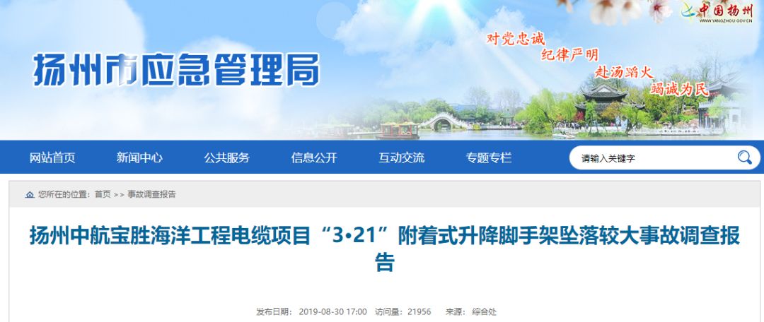 2019年3月,扬州市一海底电缆项目施工工地发生一起附着式升降脚手架坍塌事故,事故造成7人死亡、4人受伤。