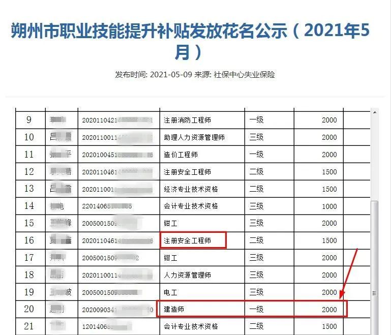 近日,朔州市人力资源和社会保障局公布《朔州市职业技能提升补贴发放花名公示(2021年5月)》,从公示名单可以看出: