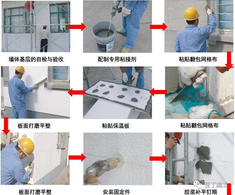 外墙等建筑围护结构的保温隔热性能是整个建筑物节能的关键,建筑墙体节能保温技术体系可分为以下三类:外墙自保温系统、外墙内保温系统、外墙外保温系统。外墙自保温系统是指按照一定的建筑构造,采用节能型墙体材料及配套专用砂浆使墙体热工性能等物理性能指标符合相应标准的建筑墙体保温隔热系统。优缺点:项目整体施工时效性高,价格相对较低,安全性能好,便于维修改造和可与建筑物同寿命等特点。但易产生热桥,内部易形成空气对流,节能效果不佳,材料自身导热系数浮动大,抗震性差等。外墙内保温系统是在墙体结构内侧覆盖一层保温材料,通过胶粘剂固定在墙体结构内侧,之后在保温材料外侧作保护层及饰面。优缺点:将保温材料复合在承重墙内侧,技术不复杂,施工简单,保温材料强度要求较低,技术性能要求比外墙外保温低,造价相对较低。但难以避免“热桥”的产生,墙体内表面易产生结露、潮湿、甚至发霉现象,防水和气密性差,不利于建筑物维护结构的保护,占用室内使用空间,内保温板出现裂缝比较普遍。外墙外保温系统是由保温层、抹面层、固定材料(胶粘剂、辅助固定件等)和饰面层构成,并固定在外墙外表面的非承重保温构造总称。优缺点:该技术体系适用范围广;保护主体结构延长建筑物寿命;基本消除了热桥的影响;使墙体潮湿情况得到改善;有利于室温保持稳定,改善室内热环境质量;有利于提高墙体防水和气密性;便于旧建筑物进行节能改造;可相对减少保温材料用量;不占用房屋的使用面积等。但保温层在墙体外侧,所处环境恶劣,对保温体系各材料要求较严格;材料要求配套及相容性好;对保温系统的耐候性和耐久性要求较高;施工难度大,要有素质较好的施工队伍和技术支持。在上述三种外墙保温技术体系中,我司较多采用外墙外保温技术,饰面材料以涂料、真石漆为主。本文主要介绍外墙外保温的施工工艺流程。