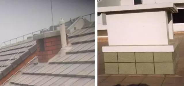排风道、屋面检查孔等处屋面平瓦与立面结构相交部位,除使用与屋面配套的柔性卷材泛水处理外,必须全部使用防水砂浆将瓦与结构(木条)之间的缝隙填满灌实。
