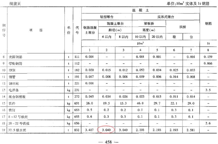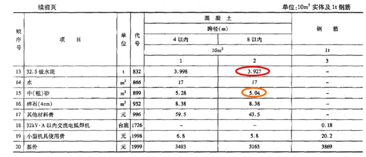 2、场内运输及操作损耗:材料消耗定额中考虑,其定额值“场内运输及操作损耗”是以百分率形式在《预算定额》附录四中体现。材料消耗定额:在节约和合理使用材料的条件下,生产单位合格产品所必须消耗的一定品种规格的材料、半成品、配件、水、电、燃料等数量标准,包括材料的净用量和必要的工艺性损耗及废料数量。计量单位以材料的实物量单位表示,如t、kg、m3。材料消耗定额=(1+材料场内运输及操作损耗率)*完成单位产品的材料净消耗32.5级水泥=0.406*(1+1%)*10=4.101t