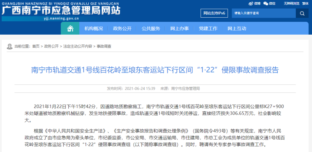 经调查认定,轨道交通1号线百花岭至埌东客运站下行区间“1·22”侵限事故为一般生产安全责任事故。