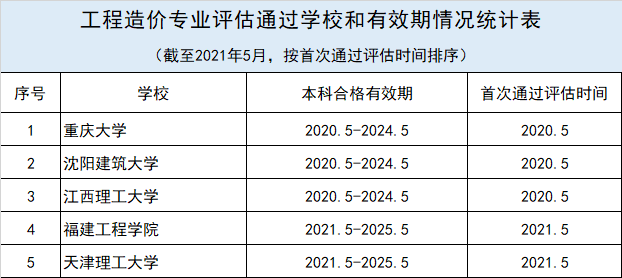 7、 工程造价专业评估通过学校和有效期情况统计表(截至2021年5月,按首次通过评估时间排序)