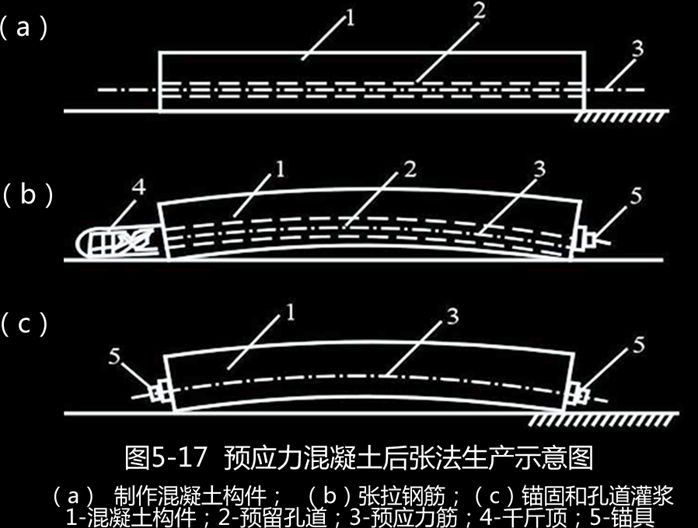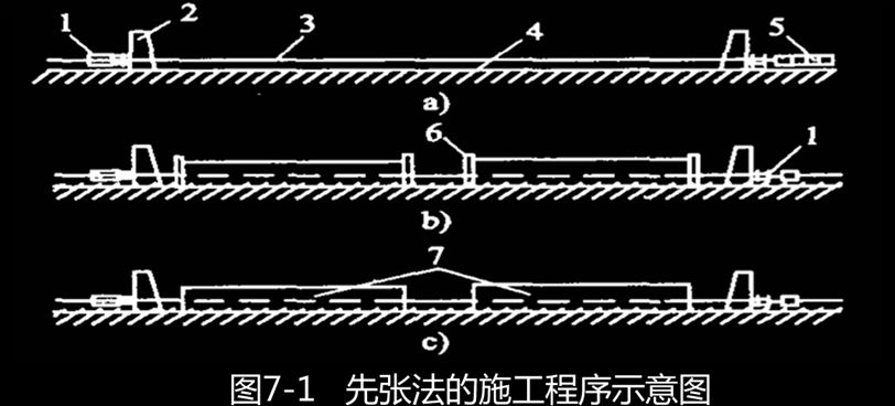a)张拉钢筋;b)浇筑混凝土;c)放松或切断预应力筋