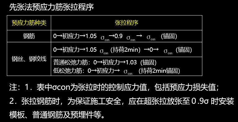 4.张拉程序应符合设计要求,设计未规定时,其张拉程序应符合表1K412015-1的规定。张拉钢筋时,为保证施工安全,应在超张拉放张至0.9σ时安装模板、普通钢筋及预埋件等。