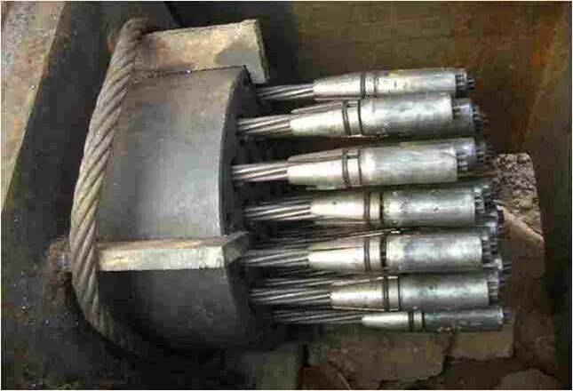 3、静载锚固性能试验:对大桥、特大桥等重要工程,当质量证明书不齐全、不正确或质量有疑点时,在通过外观和硬度检验的同批中抽取6套锚具(夹片或连接器),组成3个预应力筋锚具组装件,由国家或省级质量技术监督部门授权的专业质量检测机构进行静载锚固性能试验。如有一个试件不符合要求时,则应另取双倍数量的锚具(夹具或连接器)重做试验,如仍有一个试件不符合要求时,则该批产品视为不合格品。