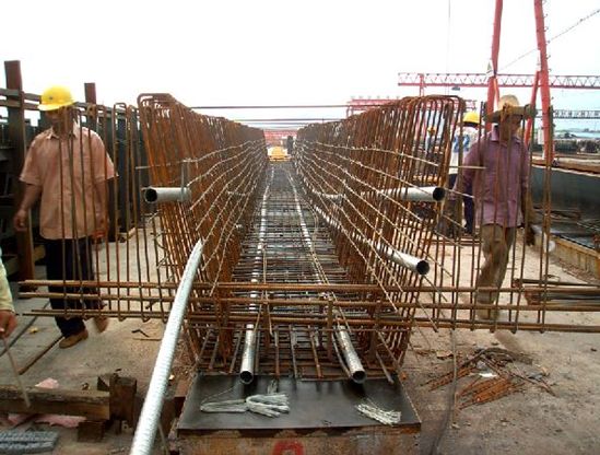 2.预应力筋连同隔离套管应在钢筋骨架完成后一并穿入就位。就位后,严禁使用电弧焊对梁体钢筋及模板进行切割或焊接。隔离套管内端应堵严。
