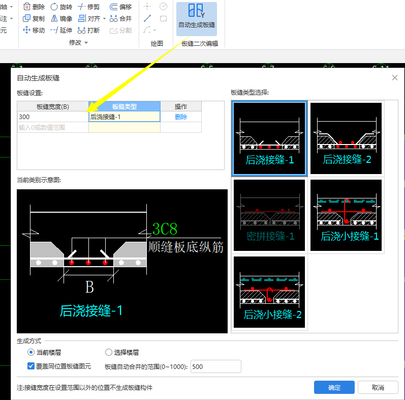 自动生成板缝,在下图的表格中输入板缝宽度(图纸中有几种宽度输入几行数据),选择板缝参数并输入相应信息,确定即可生成板缝。