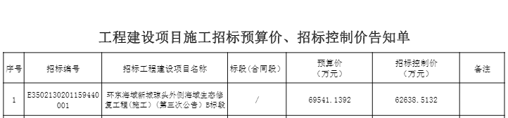 2020年10月公示的环东海域新城琼头外侧海域生态修复工程(施工)(第三次公告)施工招标,其A标段招标控制价为48332万元,而中标单位的中标价仅为485万元。