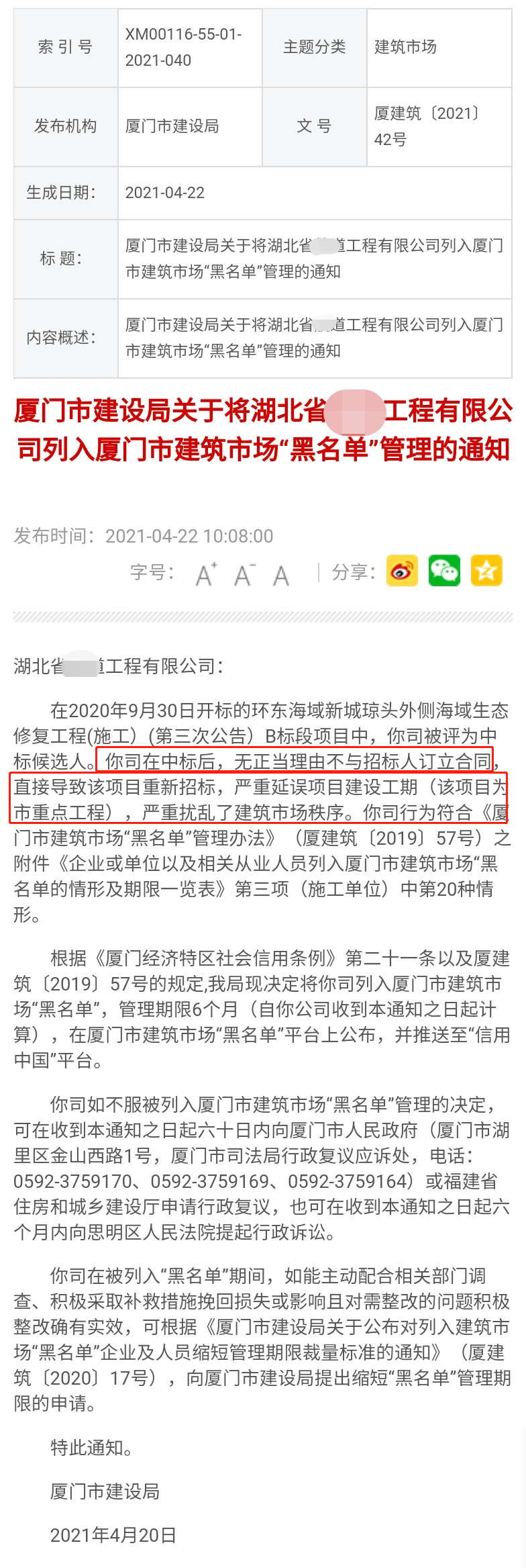 2020年11月12日招标人发出中标通知书,并约谈中标人湖北XX工程有限公司,该公司多次承诺将按照招标文件规定按时履约。中标通知书发出三十日后,湖北XX工程有限公司无正当理由不与招标人订立合同,直接导致项目重新招标,招标人已没收其投标保证金80万元。2021年4月22日厦门市建设局官网通报,将湖北XX工程有限公司列入厦门市建筑市场“黑名单”。官网通报截图: