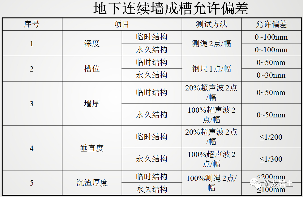 在地下连续墙施工过程中,因各种因素影响,会导致泥浆性质劣化,其主要原因有:由于形成泥皮消耗了泥浆,由于地下水或雨水稀释了泥浆,粘土细颗粒混入泥浆,砼中的钙离子混入泥浆,土中或地下水的阳离子混入泥浆。◆ 地连墙施工2~3幅作为试验段,通过试验段了解成槽、清孔泥浆的比重、粘度等性能指标,对后续地连墙施工中泥浆配合比进行调整优化。◆ 泥浆制作中每班进行二次质量指标检测,新拌泥浆存放12小时使其充分膨胀后进行使用,并在泥浆池须不断用泥浆泵搅拌。◆ 在成槽过程中,泥浆面必须高出地下水位0.5m,定时对槽内泥浆进行检测,还需充分注意周围环境条件对泥浆质量的影响,如地下水位变化,排出渣土的土质与原勘探的地质情况存在差异,防止泥浆溢流流向导墙外侧,防止雨水和地面水流入沟槽内。◆ 成槽后泥浆在槽内静置时间较长,槽内泥浆易降低质量,悬浮在泥浆中的土渣会沉淀,从而使泥浆比重减小,会使形成的泥皮薄弱而且防渗性差。因此在泥浆静置时间,向槽内适当补充一些新拌制的泥浆并定期进行质量检测。◆ 被使用过的泥浆通过除砂器,将土颗粒和碎石块除去,然后把干净的泥浆 重新输送回到槽中。在成槽完成后,将铣槽机放到槽底,抽换使用过的泥浆,并通过除砂器循环利用,同时将新鲜的泥浆供送到槽的上部。这个过程一直持续到泥浆能够满足吊装钢筋笼和浇筑 砼的指定标准。