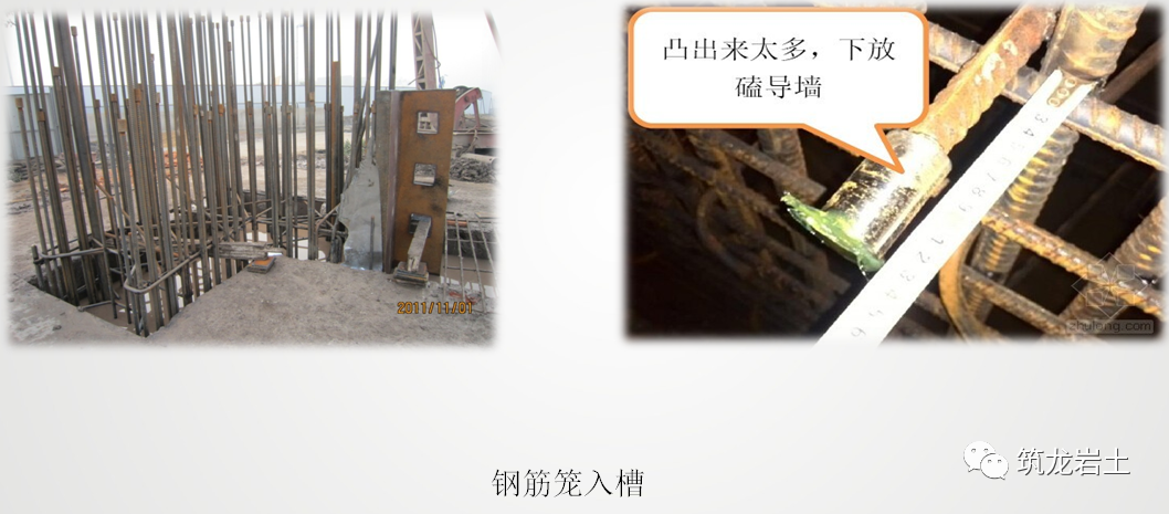 ⑴ 吊装钢筋笼前,吊装前施工方案必须进过专家论证,应对钢筋笼进行“质量三检”,并填写“隐蔽工程验收单”,请监理验收签证,否则,不能进行吊装作业。⑵ 吊装钢筋笼前,应搞清开挖面方向,因为开挖面与临土面的配筋往往是不对称的,如搞错,则受力条件完全相反了。⑶ 如果用履带式起重机长距离吊运钢筋笼,钢筋笼必须呈垂直悬空状态。⑷吊装拐角形钢筋笼时,应设置“人字形”桁架,并增加一些特殊的斜拉杆加强其刚度,防止钢筋笼变形,待钢筋笼下槽时,再渐次拆除。钢筋笼制作完成后在起吊前检查所有埋设的埋件、钢筋接驳器的数量和位置以及监测设备安装是否准确,符合质量标准要求后方能起吊入槽。在钢筋笼吊放前要再次复核导墙上4个支点的标高,精确计算吊筋长度,保证钢筋笼位置的准确。在钢筋笼下放到位后,由于吊点位置与测点不完全一致,吊筋会拉长等,会影响钢筋笼的标高,应立即用水准仪测量钢筋笼的笼顶标高,根据实际情况进行调整,将笼顶标高调整至设计标高。