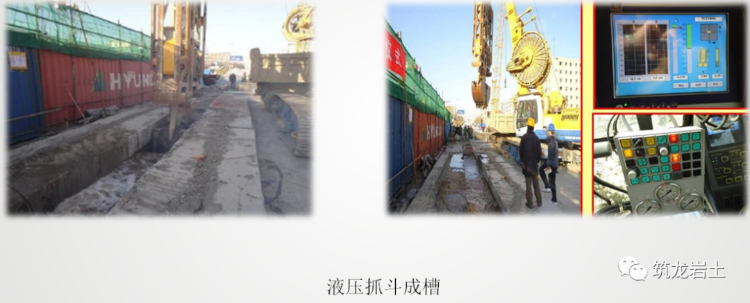 成槽施工首先使用液压抓斗进行槽段开挖,液压抓斗的冲击力和闭合力足以抓起强风化岩以上各层,在成槽过程中,严格控制抓斗的垂直度及平面位置,尤其是开槽阶段。仔细观察监测系统,X、Y轴任一方向偏差超过允许值时,立即进行纠偏。抓斗沿地连墙中心轴线入槽,机械操作要平衡。并及时补入泥浆,维持导墙中泥浆液面稳定 。