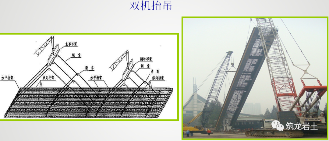 钢筋笼的起吊通常采用履带式起重机进行,因为钢笼起吊后,起重机需要将垂直吊起的钢笼运输至孔口进行下放。钢筋笼的起吊与安放应根据其重量与长度,选择匹配的吊车,一般采用单机起吊和双机抬吊方式,由专人统一指挥。入槽时应徐徐下降、平稳入槽,不得强行快速下放,入槽后应根据测定的导墙高程准确控制笼顶标高。