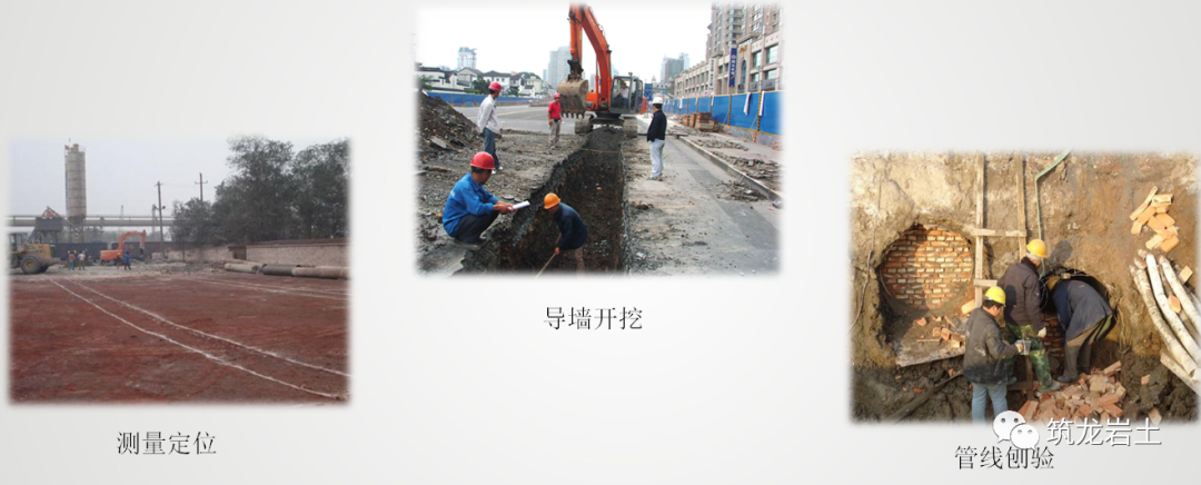 ◆ 导墙设置高出地下水位1.5m,墙趾进入原状 土层300mm以上,导墙底标高低于地连墙顶标 高20cm以上。如导墙施工区域原状土受到破坏、土质松散,墙趾无法进入坚实 原状土层,导墙修筑前进行土体加固。◆ 根据管线图分布图上管线位置,对需切改管线区域上方路面进行破除。并对管线具体位 置进行探测。管线破除后,对废气管线截面进行封堵,该区域用水泥土进行回填。