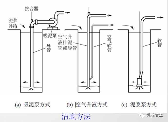 清除槽底沉渣的方法有:①吸泥泵排泥法;②空气升液排泥法;③带搅动翼的潜水泥浆泵排泥法;④水轮冲射排泥法;⑤抓斗直接排泥法。在这些方法中,前三种是常用的方法,如图所示。